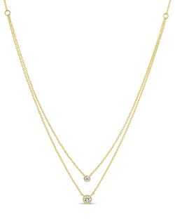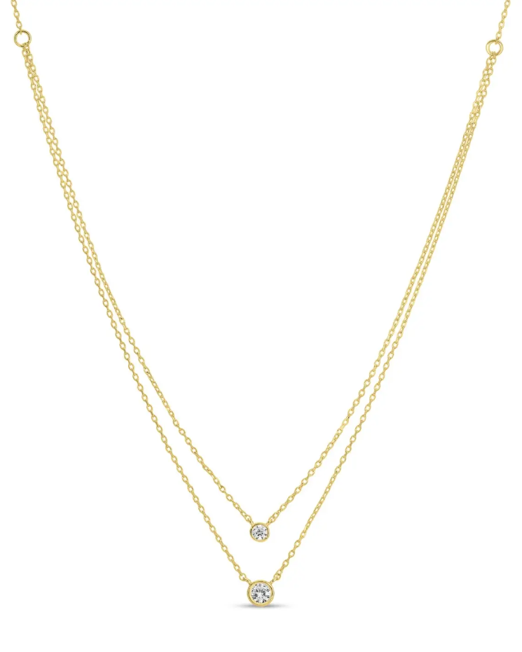 Elevate your everyday style with this stunning double-layered necklace, crafted in 18k gold plating for a luxurious finish. Two delicate chains work together to showcase beautifully framed cubic zirconia pendants that catch the light with every movement. The layered design adds dimension and sophistication.