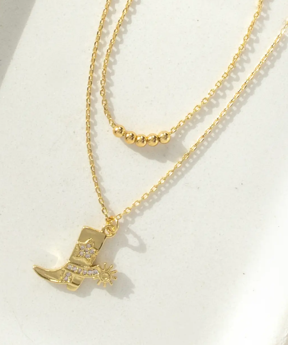 Double Layer Necklace - 15" delicate beads + 16" cowgirl boot pendant with cz accents.
