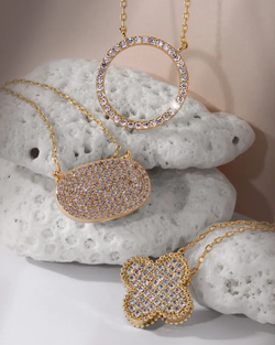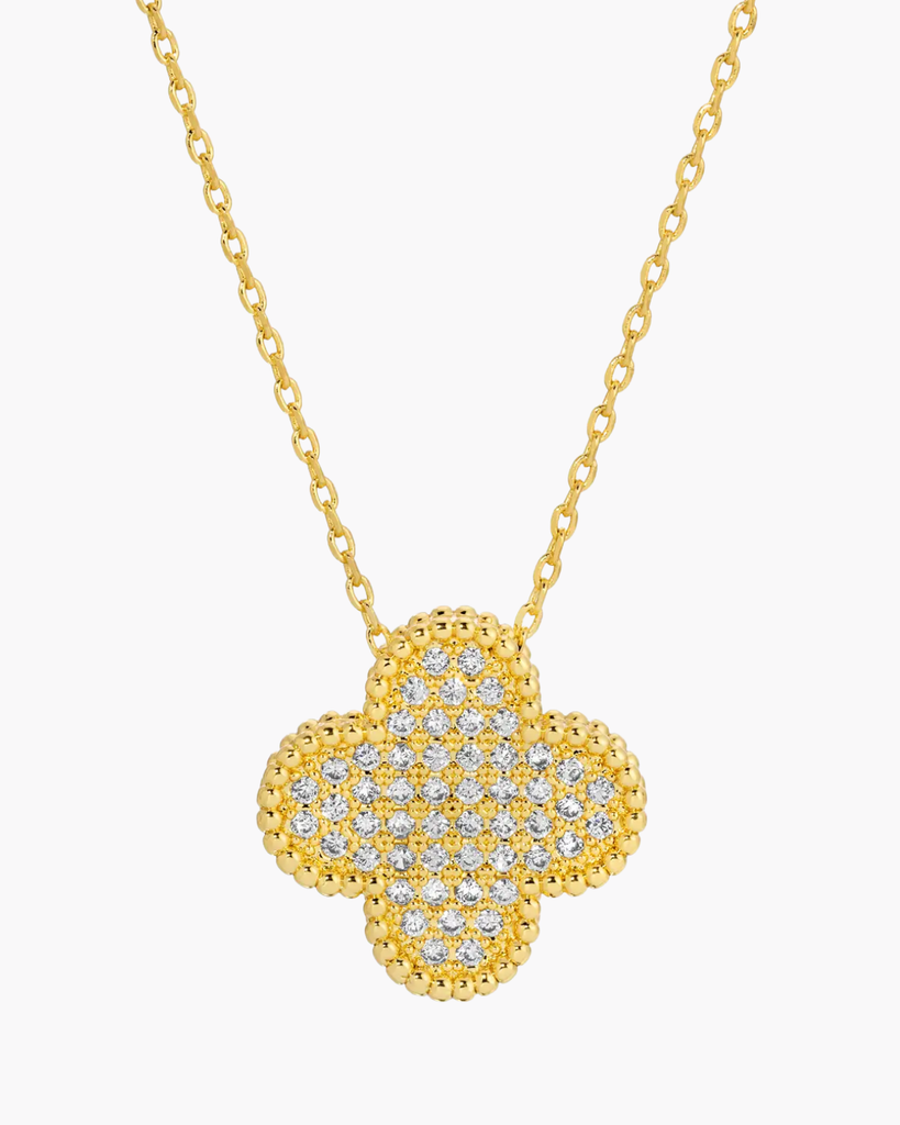 Experience an elegant touch of luck with our exquisite Pave Quatrefoil Necklace. The chain elegantly weaves through the top, symbolizing the interconnectedness of all things. Elevate your style with this timeless piece.