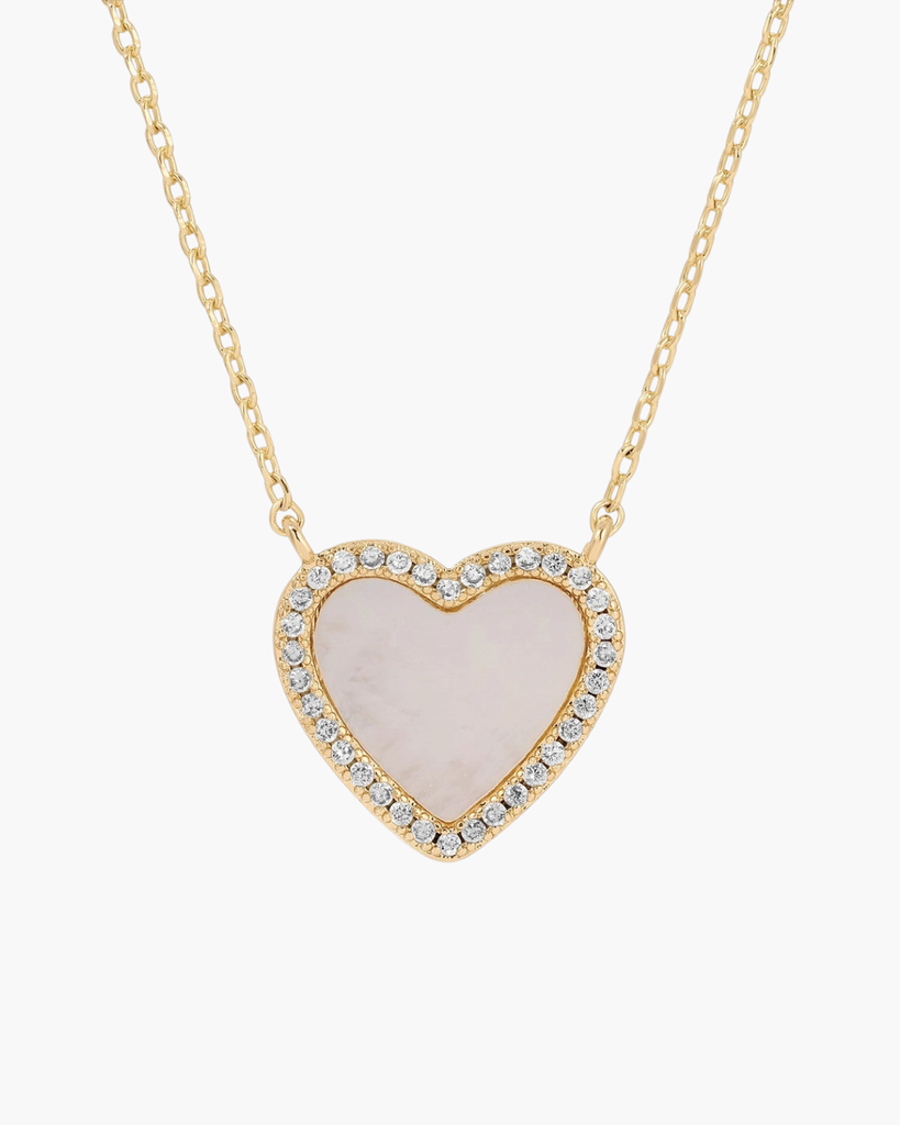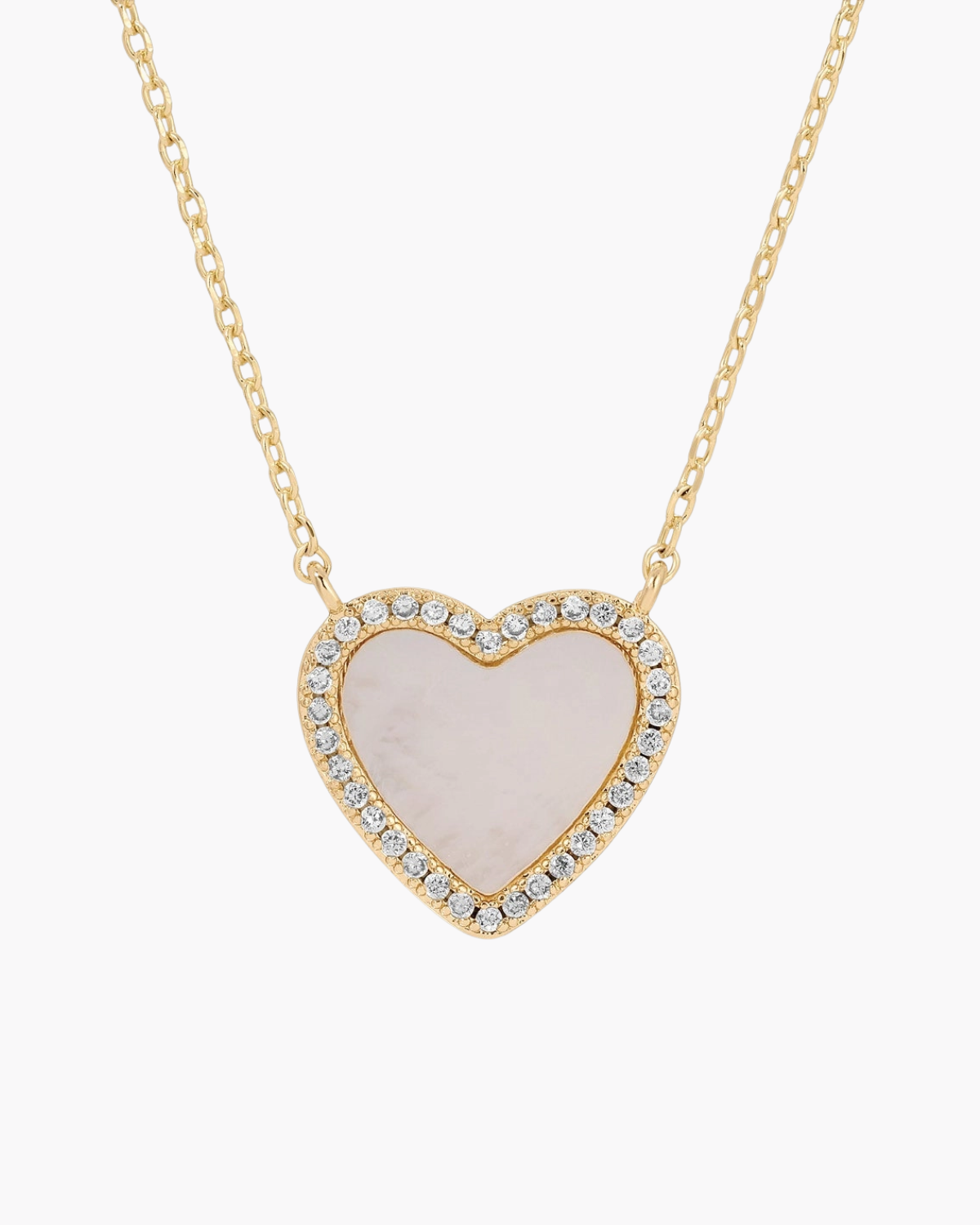 This charming necklace showcases a tiny heart filled with shell, framed by a sparkling pave border. It's the perfect playful touch to brighten any outfit!