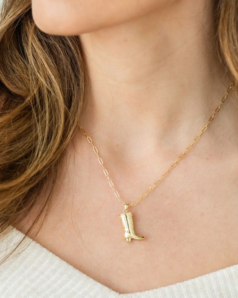 Get ready to shine with our Dimensional Cowgirl Boot Pendant Necklace, featuring a detailed 3D boot plated in warm 18K gold for a touch of Western wow. Whether you’re channeling rodeo vibes or adding country charm, this playful necklace is perfect alone or layered to boost your style.