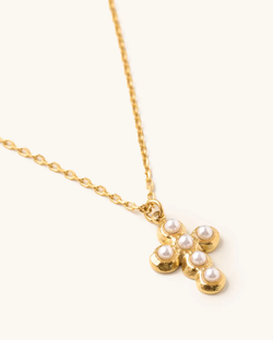 Simple and sweet, this pearl cross necklace is all you need to light up the room.