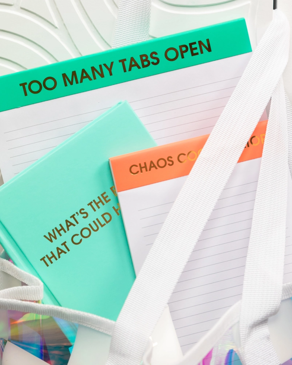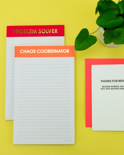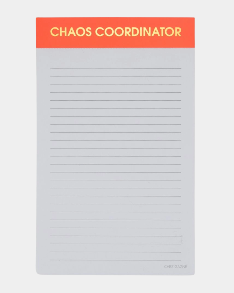 The Chaos Coordinator Notepad, with its vibrant neon orange cover and shiny gold foil lettering, is perfect for multitaskers juggling a busy day (and the occasional slip-up). It’s a fun, practical way to keep your lists and reminders all in one place.