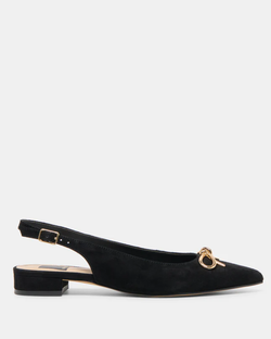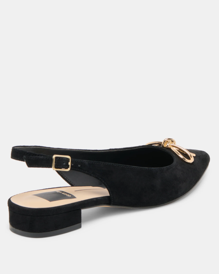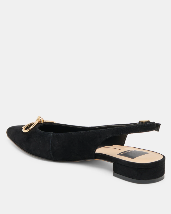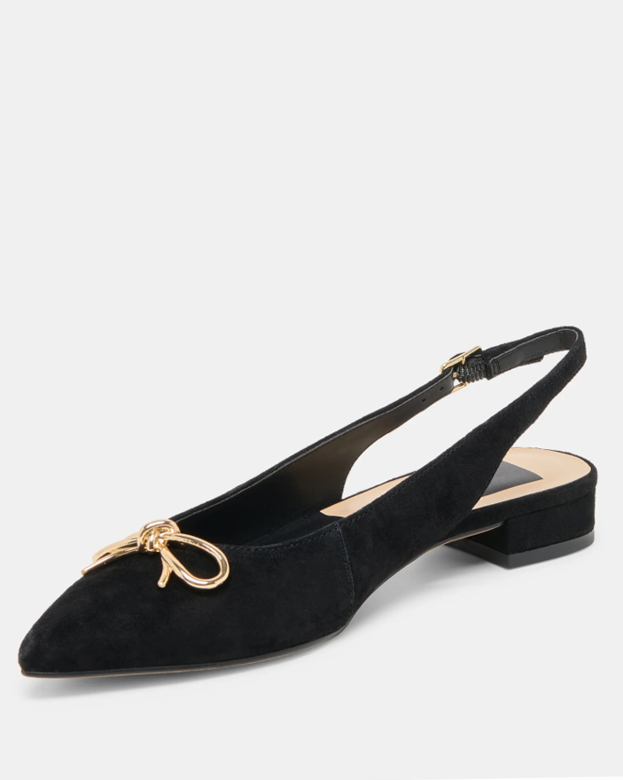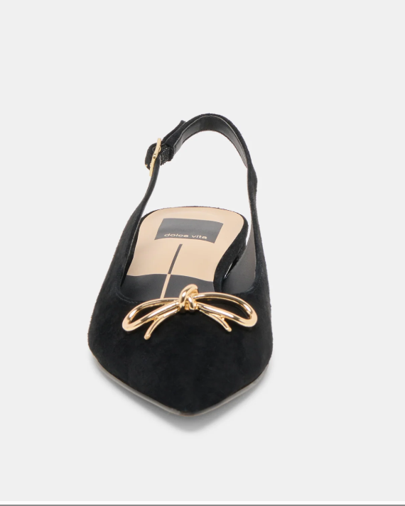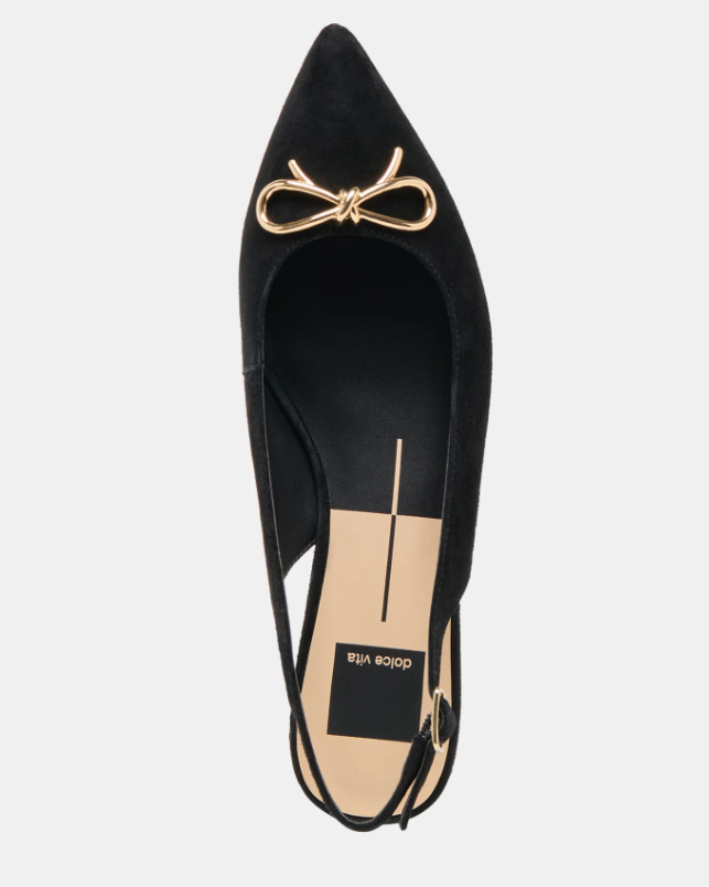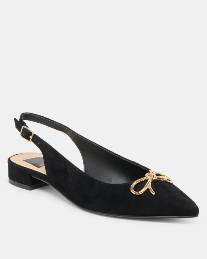 Dress up in easy-to-wear OBELLA. Her timeless slingback silhouette meets luxe suede and an understated metallic bow. Wear this flat as an alternative to heels or pair her with socks and a blazer.