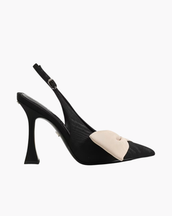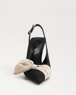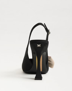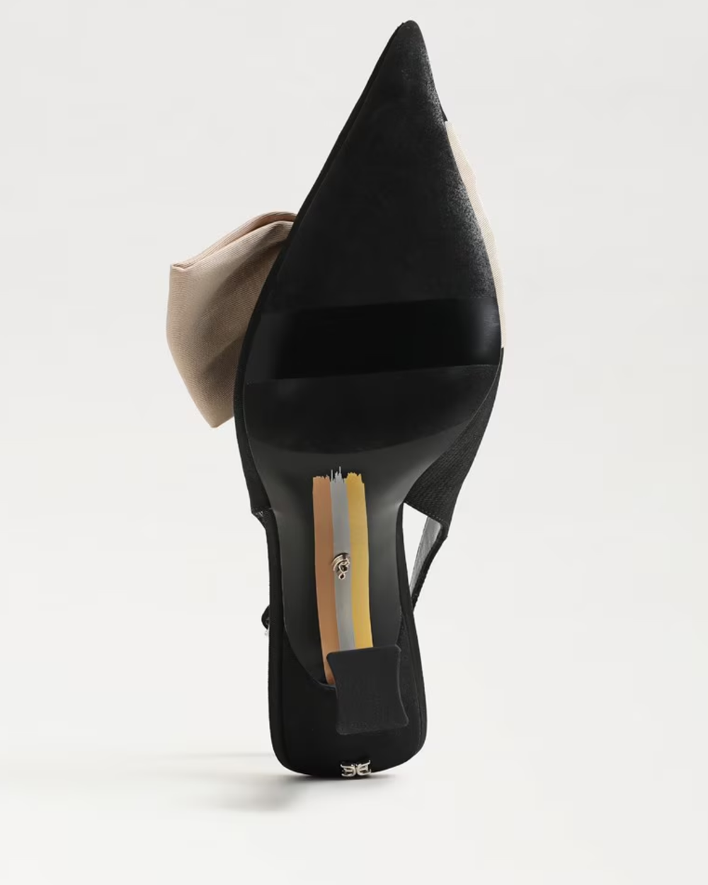 The Onia heel pairs understated sophistication with bold design details. A graceful flared heel and statement bow create an effortlessly elegant silhouette in striking black and honey sand tones—ideal for those who appreciate refined style with personality.