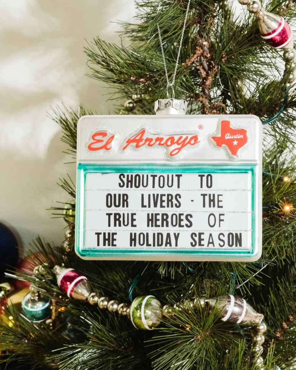 This unique ornament is bound to be the life of your holiday celebrations! Crafted from shimmering mercury glass, this delightful marquee brings a fun and quirky charm to your tree that you'll enjoy season after season.