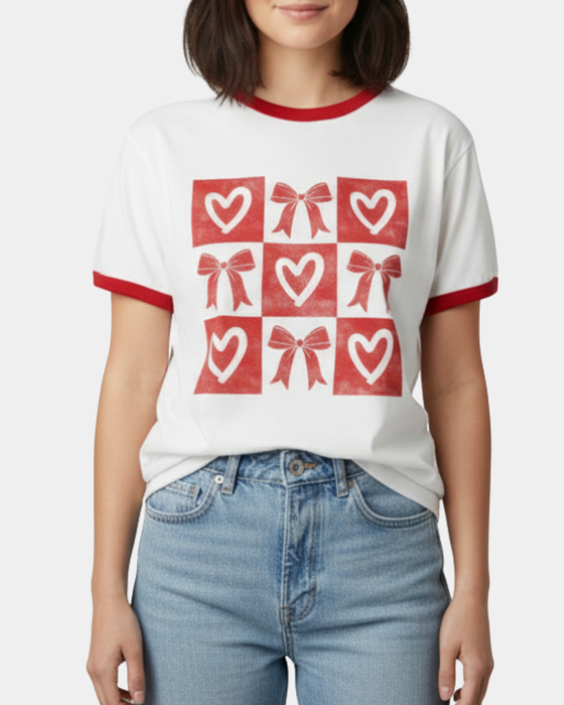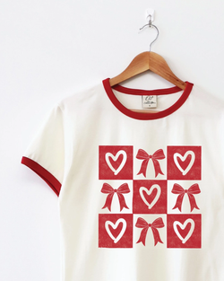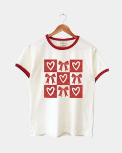 Sprinkle some joy into your closet with this delightful bow and heart grid tee. Featuring Oat Collective's signature main label design, this playful ringer shirt pairs comfort with personality in a natural and red colorway that works with everything.