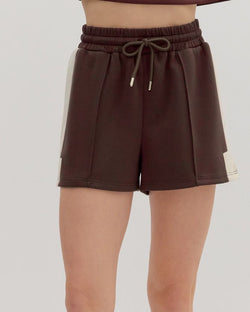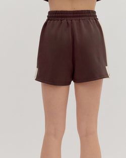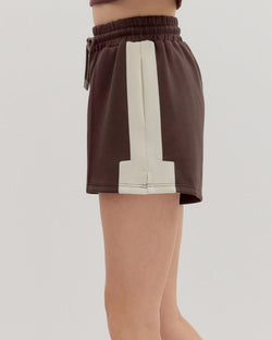 These brown and cream contrast lounge shorts are about to be your new go-to. The side panel color blocking makes these shorts stand out from the rest. Pair with the matching top for a cute set look.