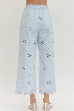 Adorable wide-leg pants with delicate eyelet embroidery and a sweet scallop hem. Style it with the matching crop top for an instant coordinated moment that's totally swoon-worthy.