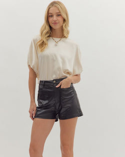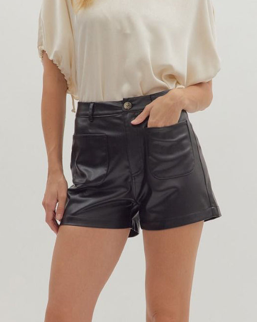 These vegan leather shorts in black feature a flattering high-rise fit designed to enhance your silhouette. Crafted from durable, cruelty-free material, they offer a sleek look perfect for fall styling. Practical front patch pockets add both style and functionality, making these shorts a versatile addition to your seasonal wardrobe.