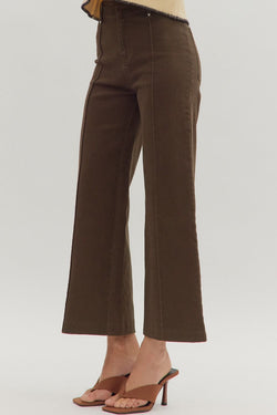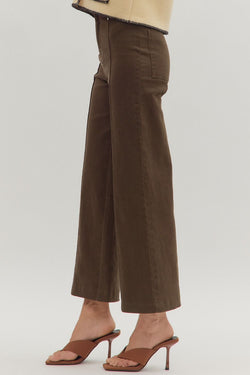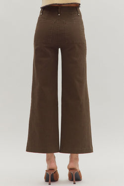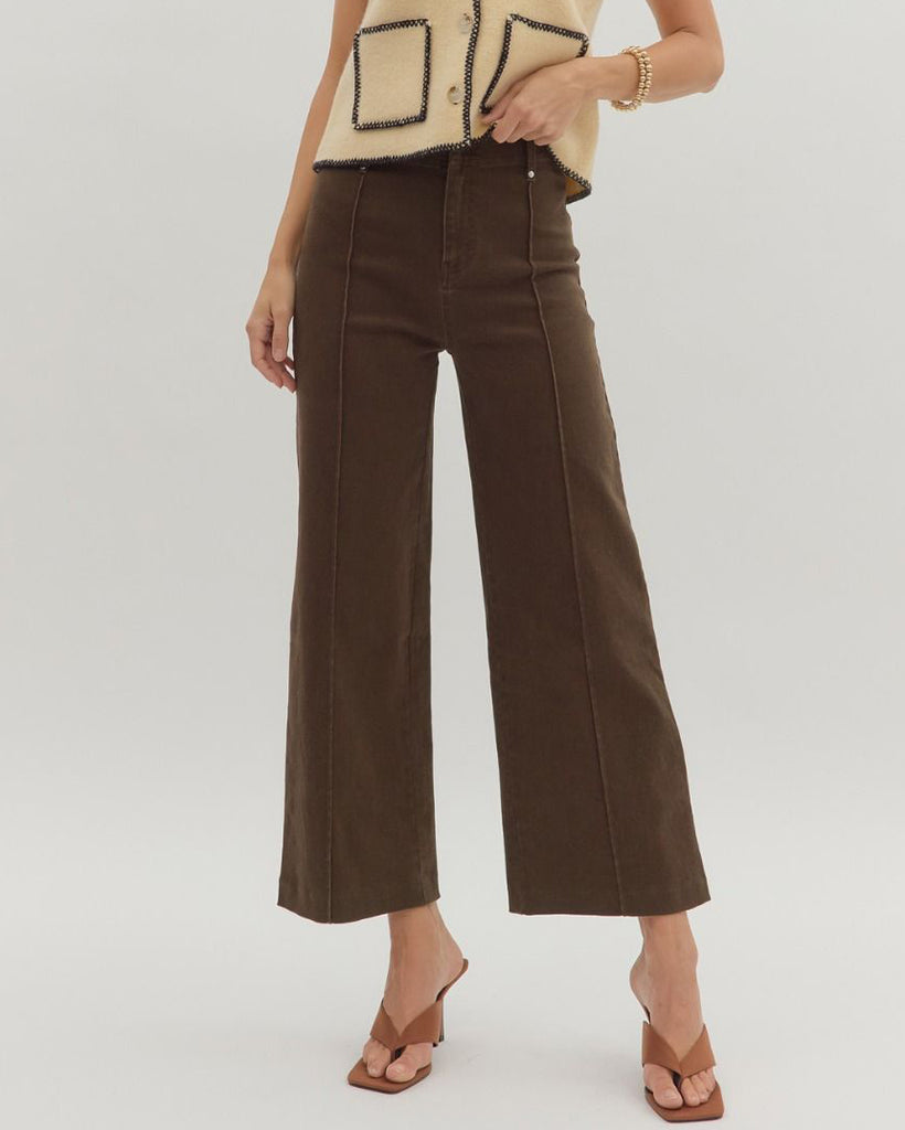 These solid high-rise wide-leg pants offer a sleek silhouette accentuated by front seam detailing. Designed with back patch pockets and a zip-fly button closure, they combine classic tailoring with effortless sophistication for a polished, modern look. Perfect for elevating your everyday wardrobe with refined style.