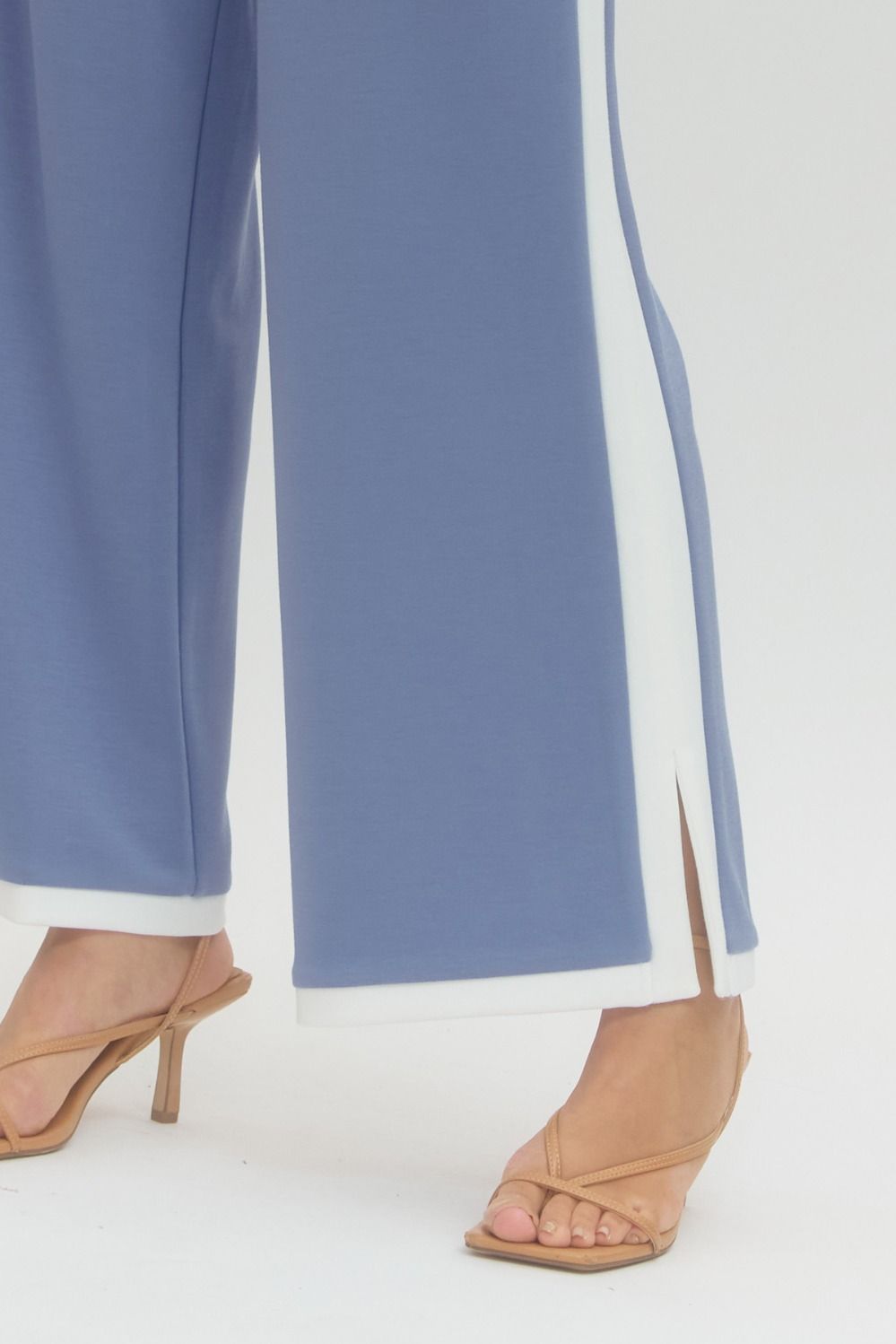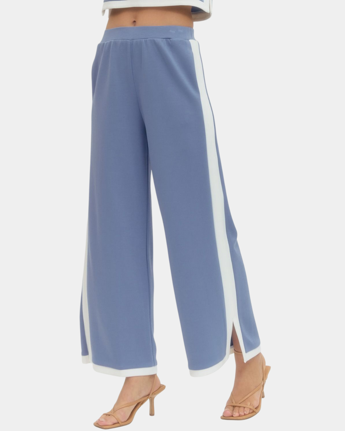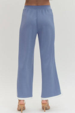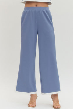 Effortlessly chic wide-leg pants with playful contrast trim running down the sides and hem. Features a comfy elasticated waistband, functional side pockets, and a flirty side slit for movement.
