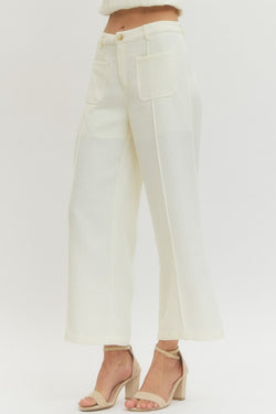 Effortlessly chic wide-leg pants in creamy ivory with functional front patch pockets—perfect for stashing your essentials while looking put-together. The relaxed silhouette keeps things comfy without sacrificing style.