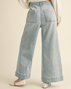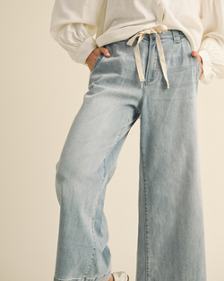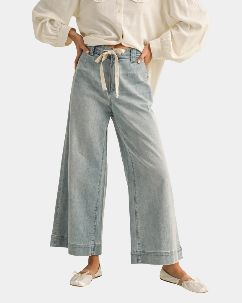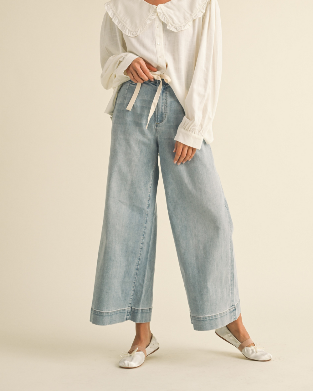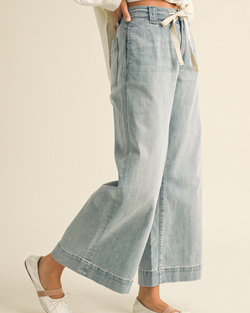Step out in style with these wide leg washed denim pants featuring a trendy tie front for a flirty, laid-back vibe.