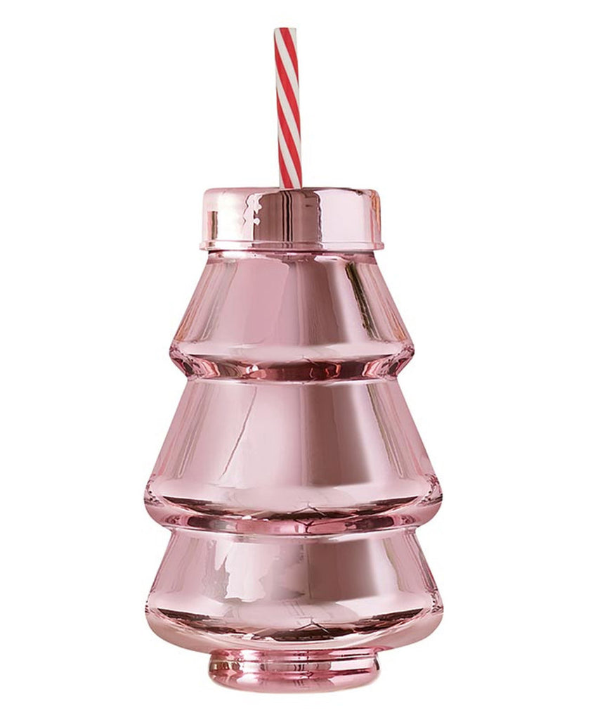 Sip in style with our Christmas tree-shaped sipper in blush, complete with a red and white striped straw