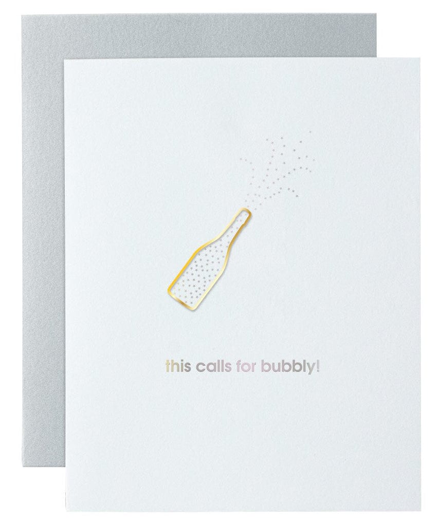 This "This Calls for Bubbly" card is letterpress printed on a vintage printing press. Card includes a heavy duty gold champagne bottle paper clip.