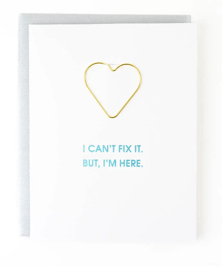 "I Can't Fix It But I'm Here" encouragement card is letterpress printed on a vintage printing press. Card includes a heavy duty heart-shaped paper clip.