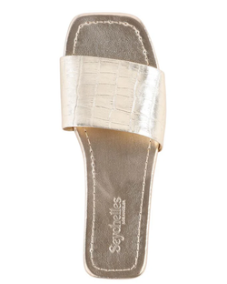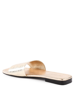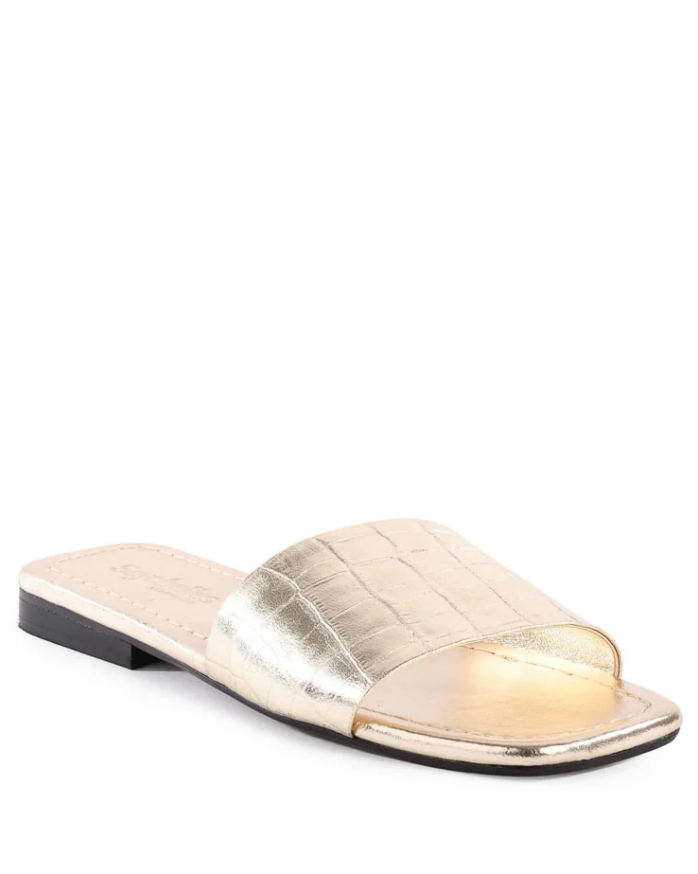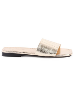 Embossed leather adds a unique croco print texture to these monochromatic metallic slides. With a chic square toe and opened up, flat silhouette, they are the perfect slip-on-and-go city sandal for a refined casual look.