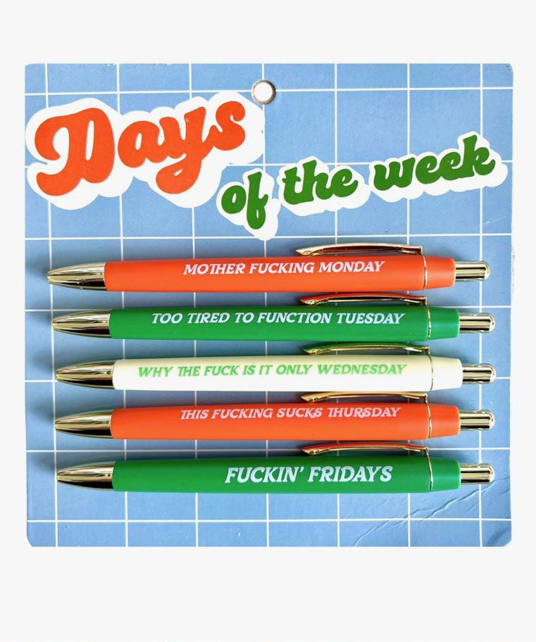 Set of 5 black Ink Ballpoint Pens with fun slogans for everyday of the week! This pen set makes the perfect stocking stuffer or funny office gift!