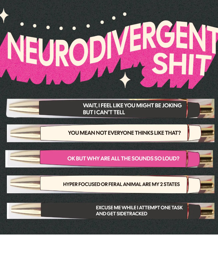 Get ready to write some quirky notes with our Pen Set - Neurodivergent Shit! This set includes multiple colorful pens that are perfect for expressing your unique way of thinking and making a bold statement.