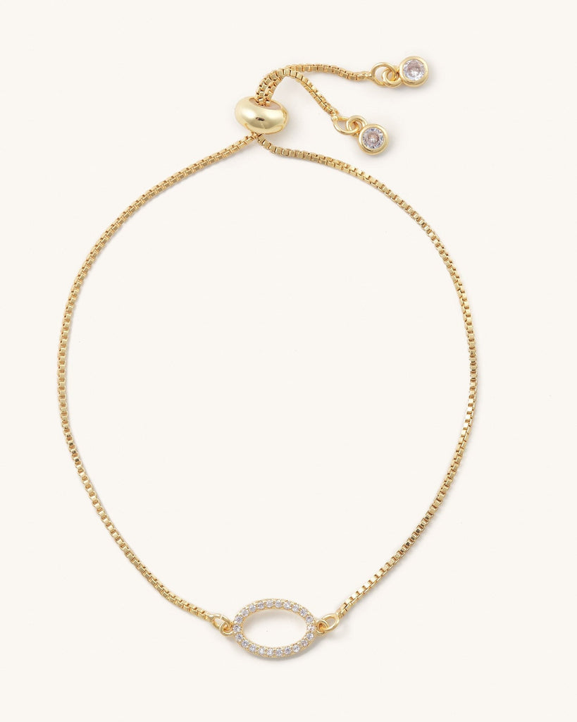 Add some sparkle to your style with the Ari Gold Slider Bracelet! The Crystal Oval charm shines bright, catching eyes and compliments. Embrace your inner gold with this playful piece. (Pun intended)