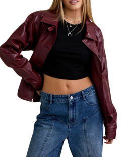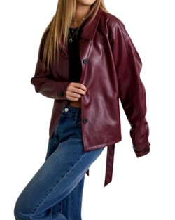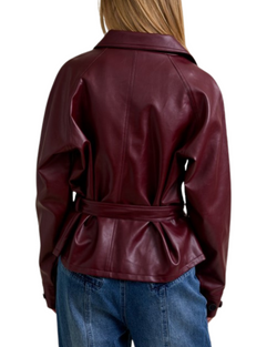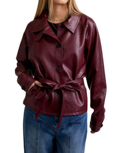This burgundy vegan leather trench coat delivers refined elegance with an ethical edge, crafted for durability and style. Its sleek silhouette and rich hue make it an essential piece for sophisticated wardrobes seeking cruelty-free fashion.
