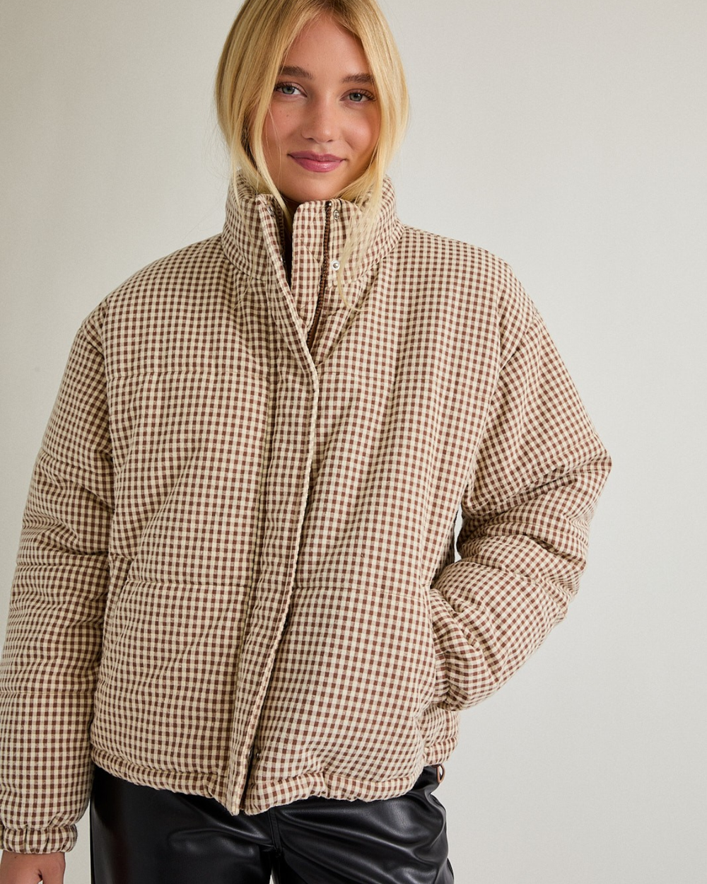 Stay cozy in style with this charming gingham puffer jacket! The classic brown and cream check pattern brings a fun, preppy vibe to any outfit, while the lightweight puffed construction keeps you warm without the bulk.