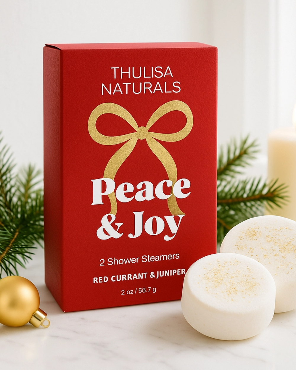 Dressed in a festive cherry red, our Peace & Joy Shower Steamers are just what you need to relax after a busy day of holiday fun like cooking or cookie baking. Bursting with the zesty scent of red currant and balanced with soothing juniper, these steamers fill your shower with cozy cheer and bright energy.