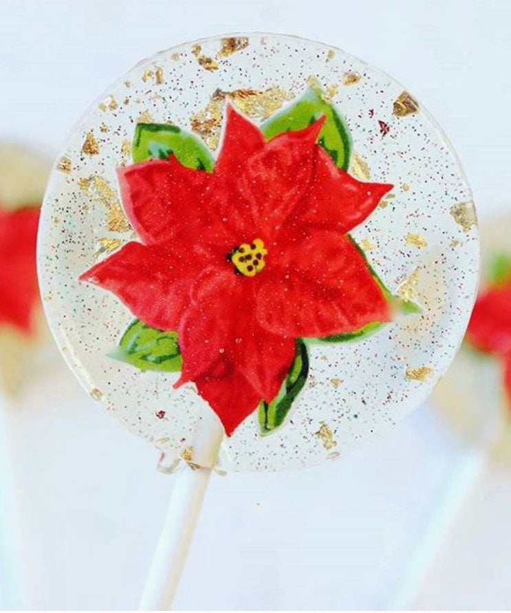 Make your holiday sparkle with this unique poinsettia lollipop, hand-cut with an edible image and topped with gorgeous gold sparkles! A delicious and eye-catching treat sure to add a bit of festive fun!