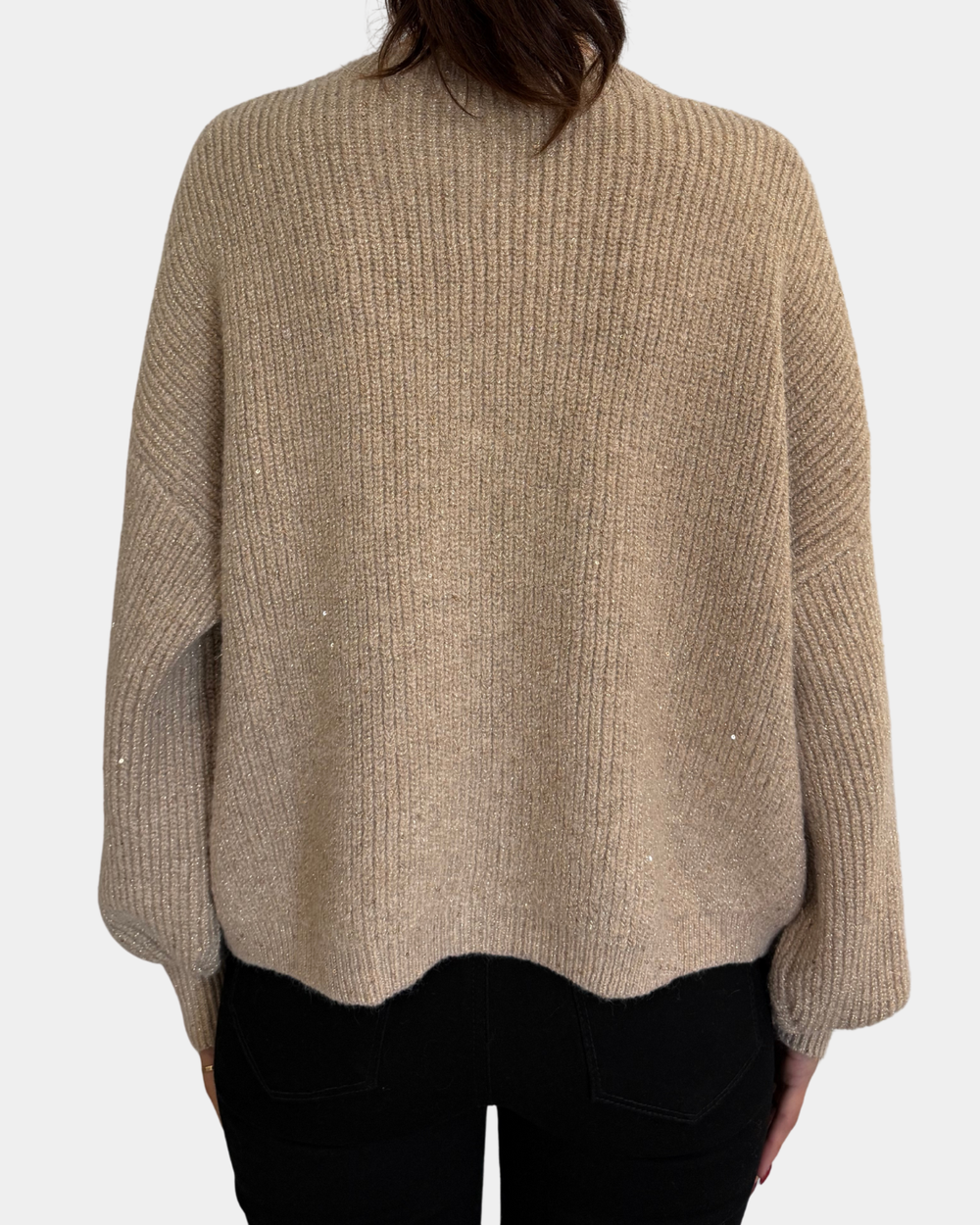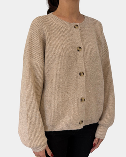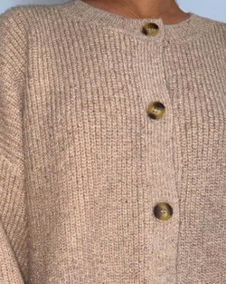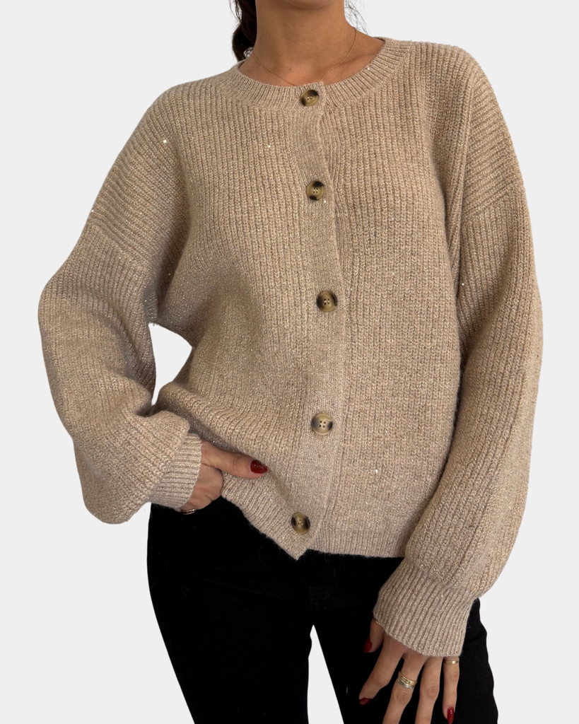 Wrap yourself in cozy chunky knit with a metallic sheer shimmer that turns heads. This tan button-front cardigan is your playful secret to staying warm.