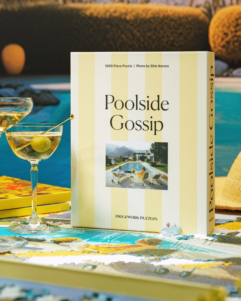 Dive into midcentury glamour with this iconic 1000-piece puzzle featuring Slim Aaron's legendary Poolside Gossip photograph. Piece together the ultimate symbol of vintage style and sophistication. Stunning cabana-stripe packaging makes it a gift-worthy treasure.