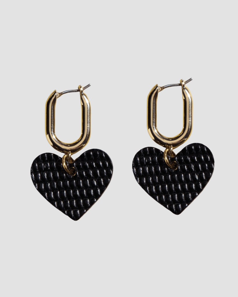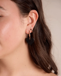 Turn heads with the Noir Quinn earrings, flaunting a fun, feather-light leather heart hanging from a cute huggie hoop.