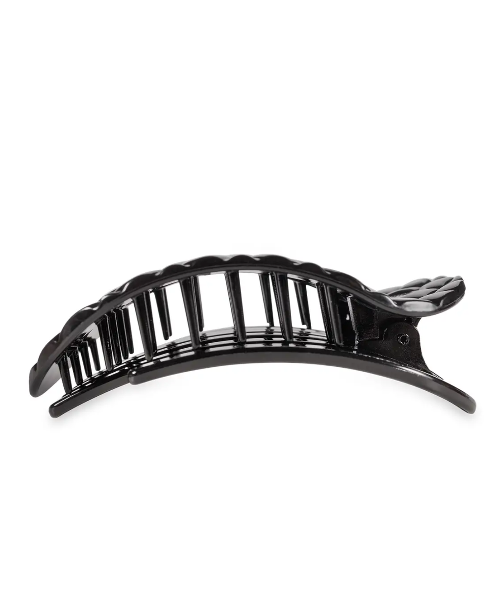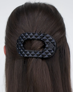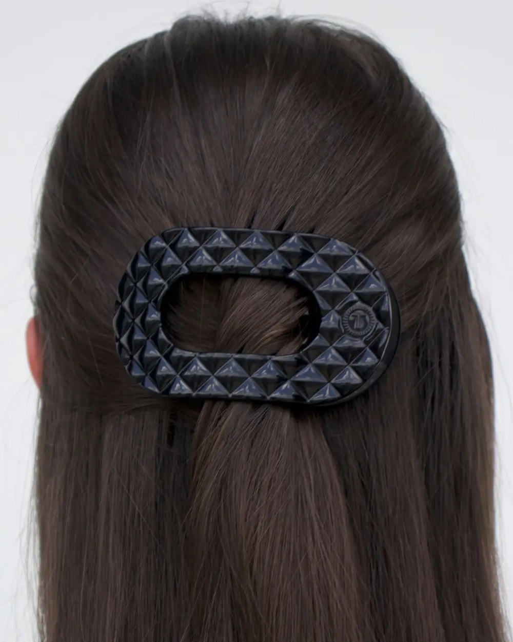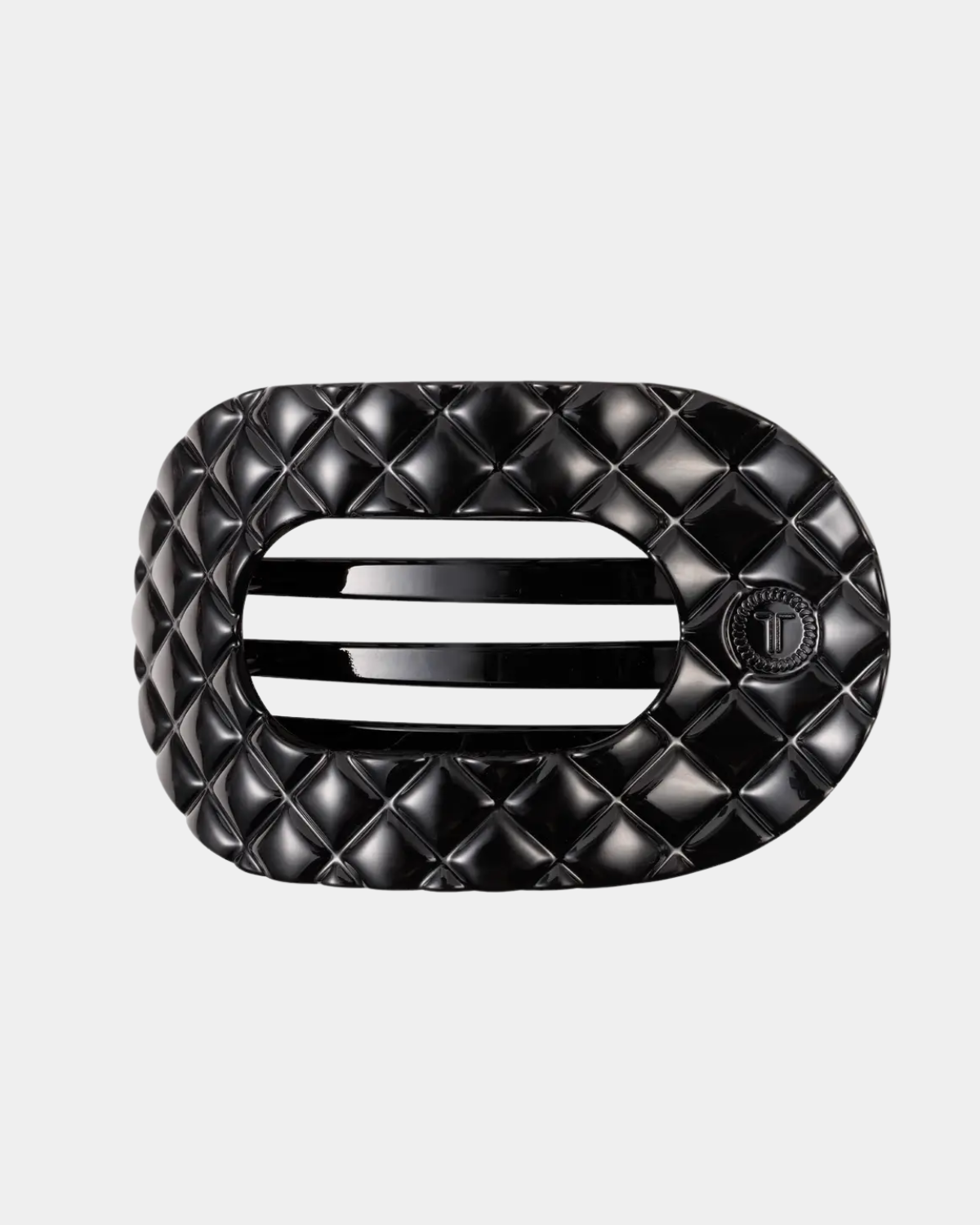 Experience comfort and style with the Jet Black Quilted Medium Flat Round Hair Clip. Crafted from nearly unbreakable material, this elegant clip allows you to recline, practice yoga, or sit with ease against a headrest while keeping your hair perfectly in place.
