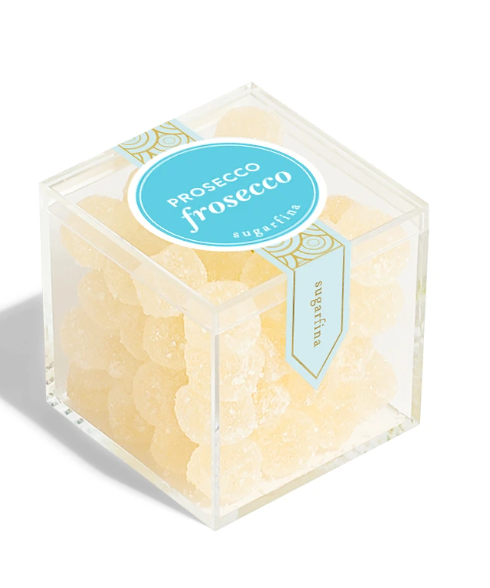 Prosecco Frosecco juicy vegan candy gems are made with your favorite bubbly and rolled in extra-fine sugar crystals. Their refreshing bubbly taste will put you in the party mood. Pop one into a glass of champagne for a little touch of sweetness!
