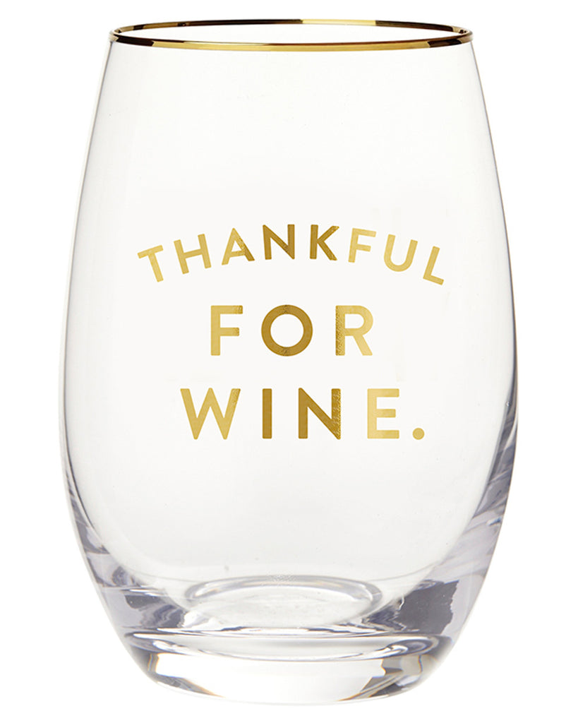 This luxurious stemless wine glass features thankful for wine phrase design with a colorful accent perfect for any night or party.