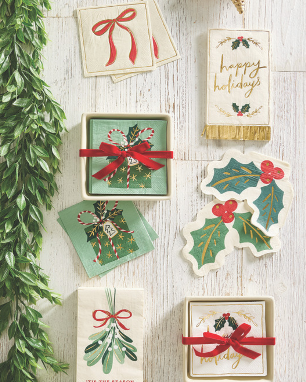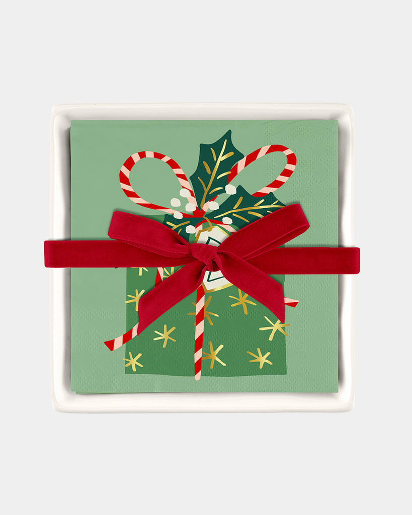 This ceramic napkin tray comes with paper cocktail napkins, making it a fun and handy way to keep your napkins neat at any party. The velvet ribbon adds a cute little pop of flair to brighten up your table.