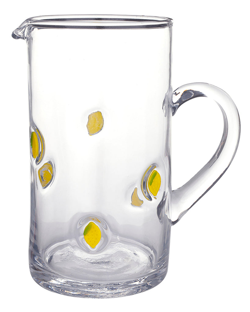 Serve sunny beverages in style with our Lemon Icon Glass Pitcher. Crafted from clear, food-safe glass and standing 8" tall with a 4.5" diameter base, this elegant pitcher is sprinkled with lemon icons that bring a fresh, cheerful vibe to any table. Ideal for iced tea, lemonade, sangria, or infused water.