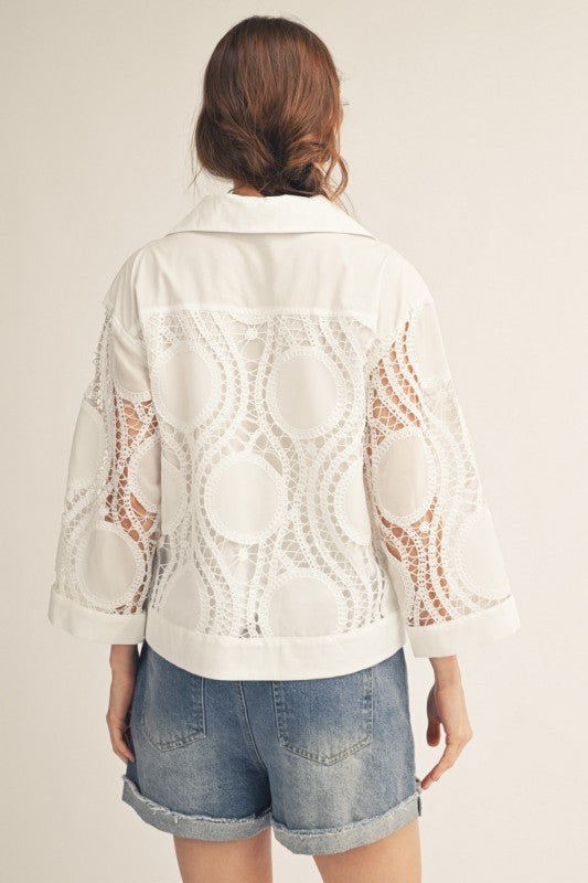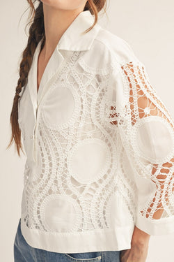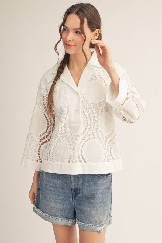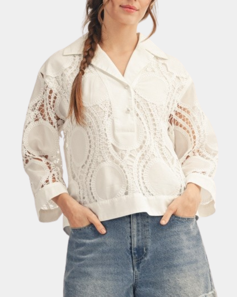 Flirt with elegance in this off-white lace top, where delicate embroidery meets a charming button front. Lightweight and versatile, it's your new go-to for adding instant sophistication to any outfit.