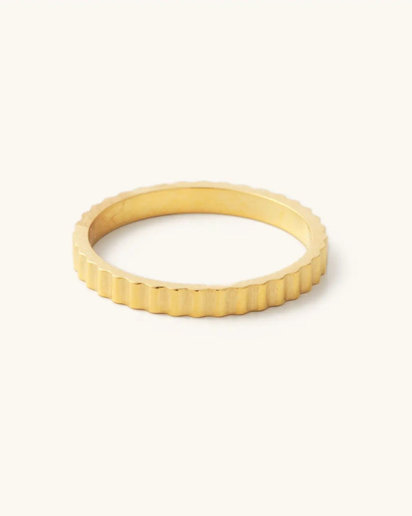 This bold band ring adds a touch of glamour and edge to any outfit. The ridged design gives it a unique texture, while the gold color adds a luxurious feel. Perfect for stacking or wearing on its own, the Dylan Ridged Band Ring is a must-have for any fashion-forward individual.