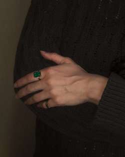 This elegant gold ring centers on an emerald-cut genuine glass stone, beautifully crafted with 14k gold plating over plated brass. Its luxurious design exudes timeless sophistication.