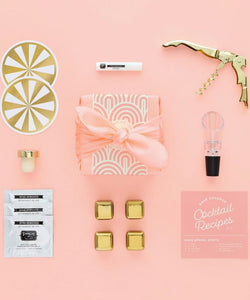 Say “yes way” to this rosé-inspired Wine Kit. With Furoshiki-inspired packaging, this peach-perfect bow box is a great way to celebrate warm climes ahead. Contains 11 must-haves: aerator/pourer, gold-tone wine stopper, gold-tone corkscrew, coasters (2), stain removing spray, "Last Glass/Keep Pouring" decision coin, wine removing towelettes (3), wine chilling cubes (4), and a Wine & Takeout pairing guide.