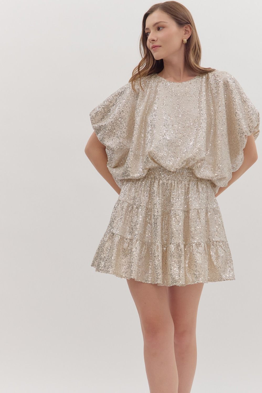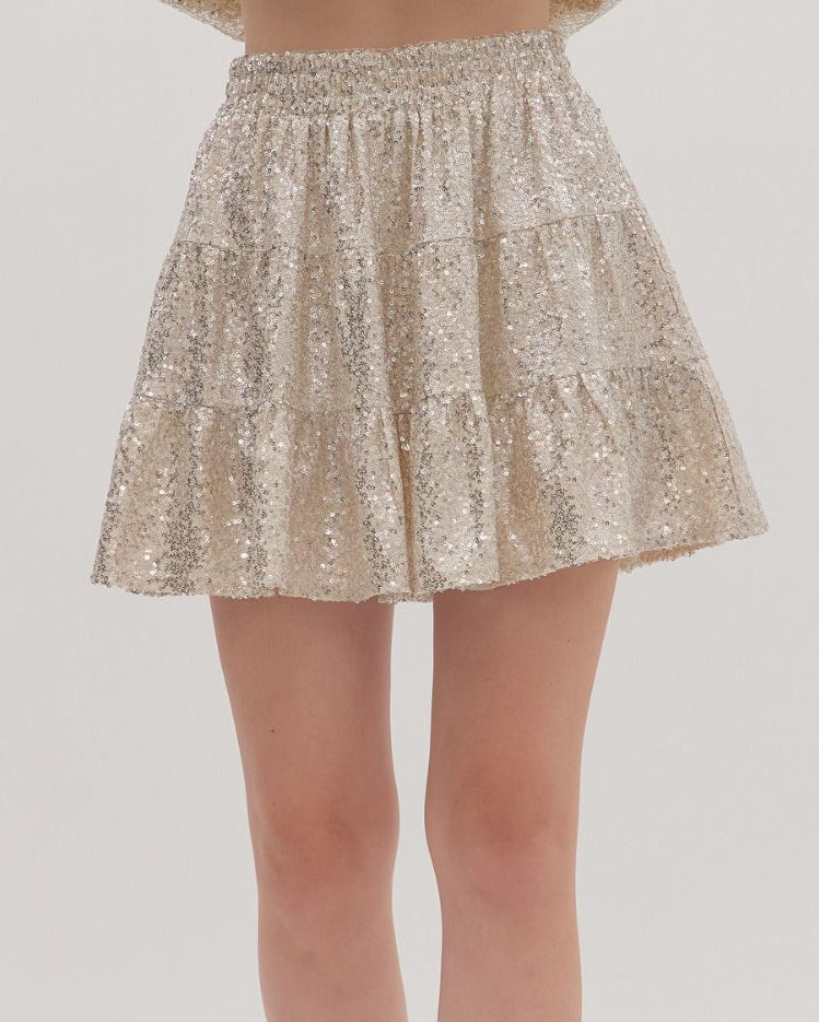 Elevate your look with this exquisite sequin mini skirt in a shimmering champagne hue. Featuring a comfortable elastic waistband and delicate tiered layers, it combines style with ease of wear. Perfect for making a refined statement at evening events or special occasions, this skirt adds a touch of glamour to your wardrobe.