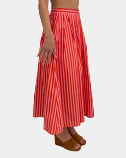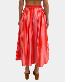 Vibrant stripes meet pleated perfection in this orange and pink skirt that's ready to turn heads. The playful color combo pairs beautifully with it's matching cropped top for an effortlessly chic look.