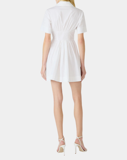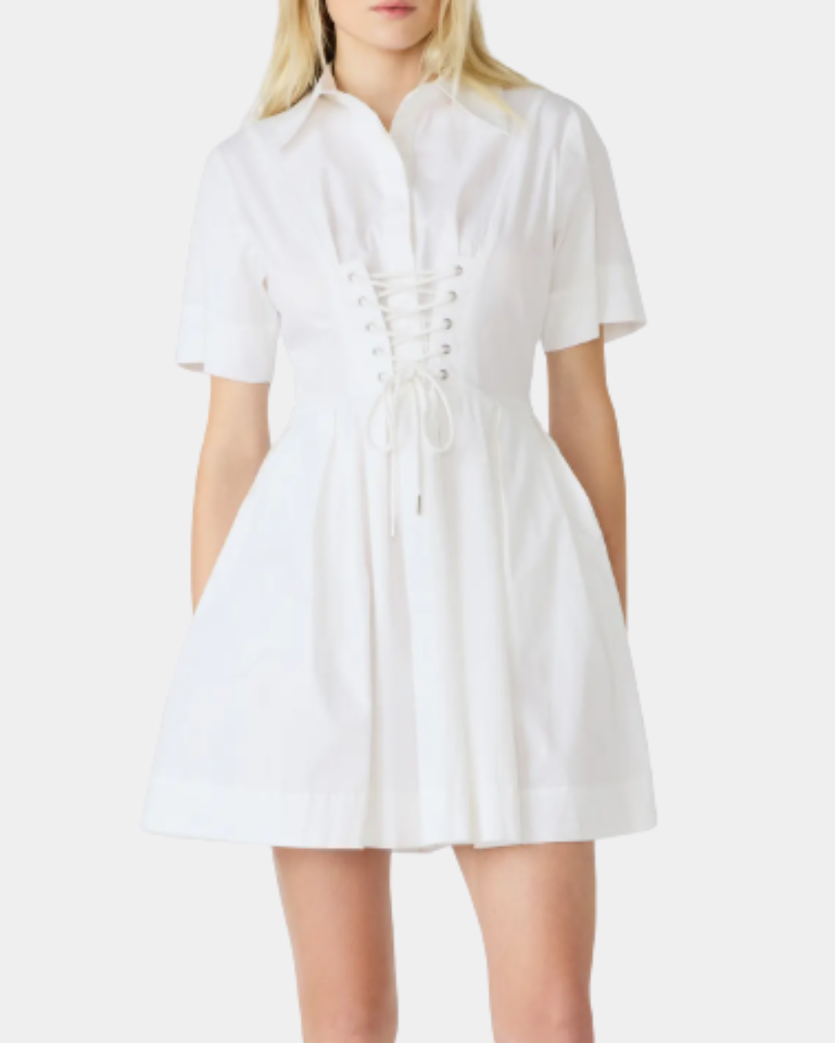 Crisp Steve Madden stretch poplin shirtdress featuring a structured laced corset bodice and flared silhouette. Short sleeves complete this refined piece with modern edge.