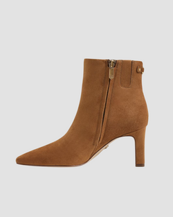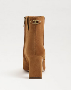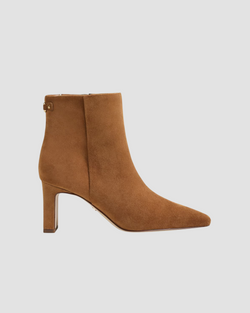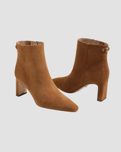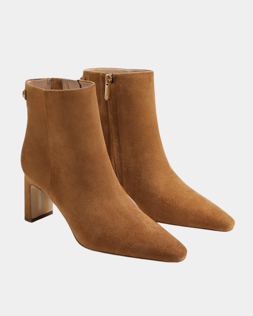 The Saige booties feature a distinctive architectural heel, offering a refined touch to elevate your classic little black dress or elegant wrap dress.