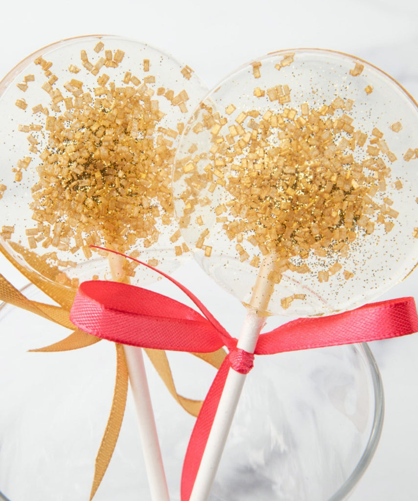 A signature clear sparkly candy with gorgeous golden sugar crystals make up this darling and tasty lollipop.