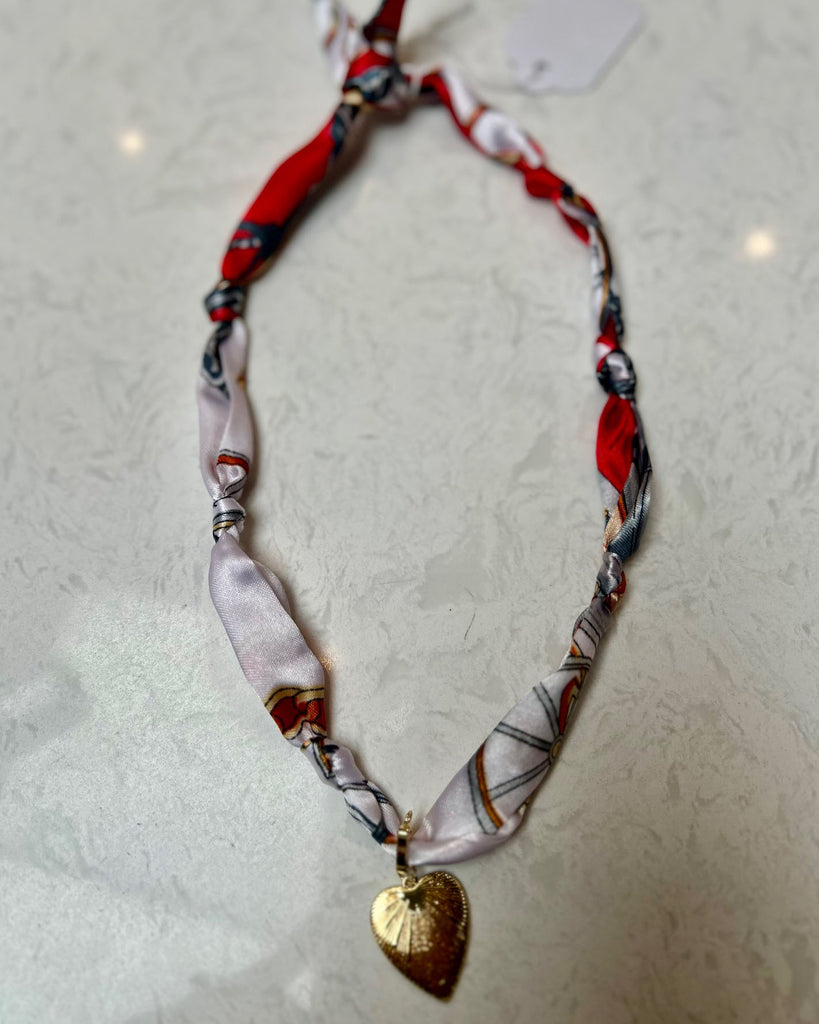 Enhance your style with the exquisite Satin Scarf Necklace. This luxurious accessory adds a pop of color to any look and can be customized with additional charms. Elevate your wardrobe with this versatile and elegant piece, perfect for any occasion.