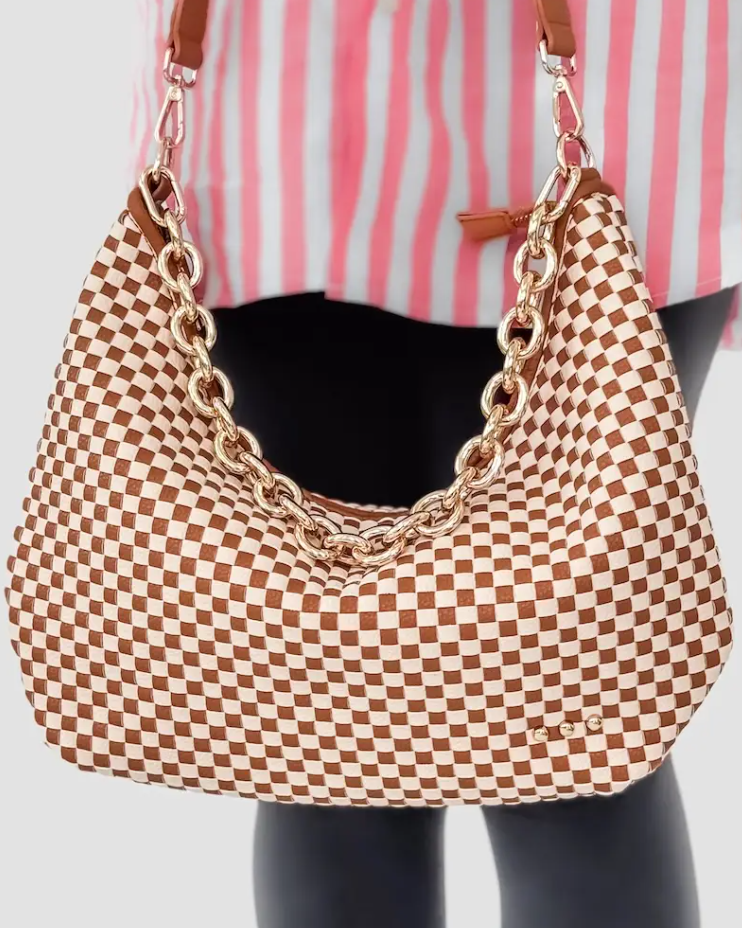 Meet our new Sienna Slouchy Woven Shoulder Bag! This woven bag features a slouchy look, a metal chain detailing, and both a short and a long shoulder strap. Elevate all your looks with this beautiful trendy bag!