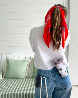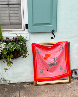 Brighten your look with this hand-drawn silk scarf featuring Kara Beth Neighbors’ playful zebra rain or stripe design. Lightweight and vibrant, it’s perfect for twirling, tying, or turning heads wherever you go!
