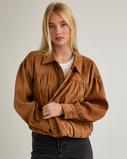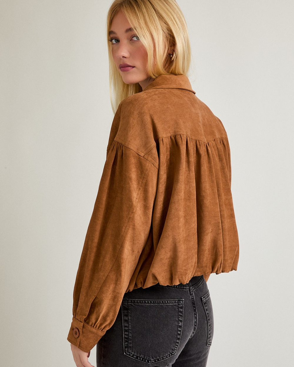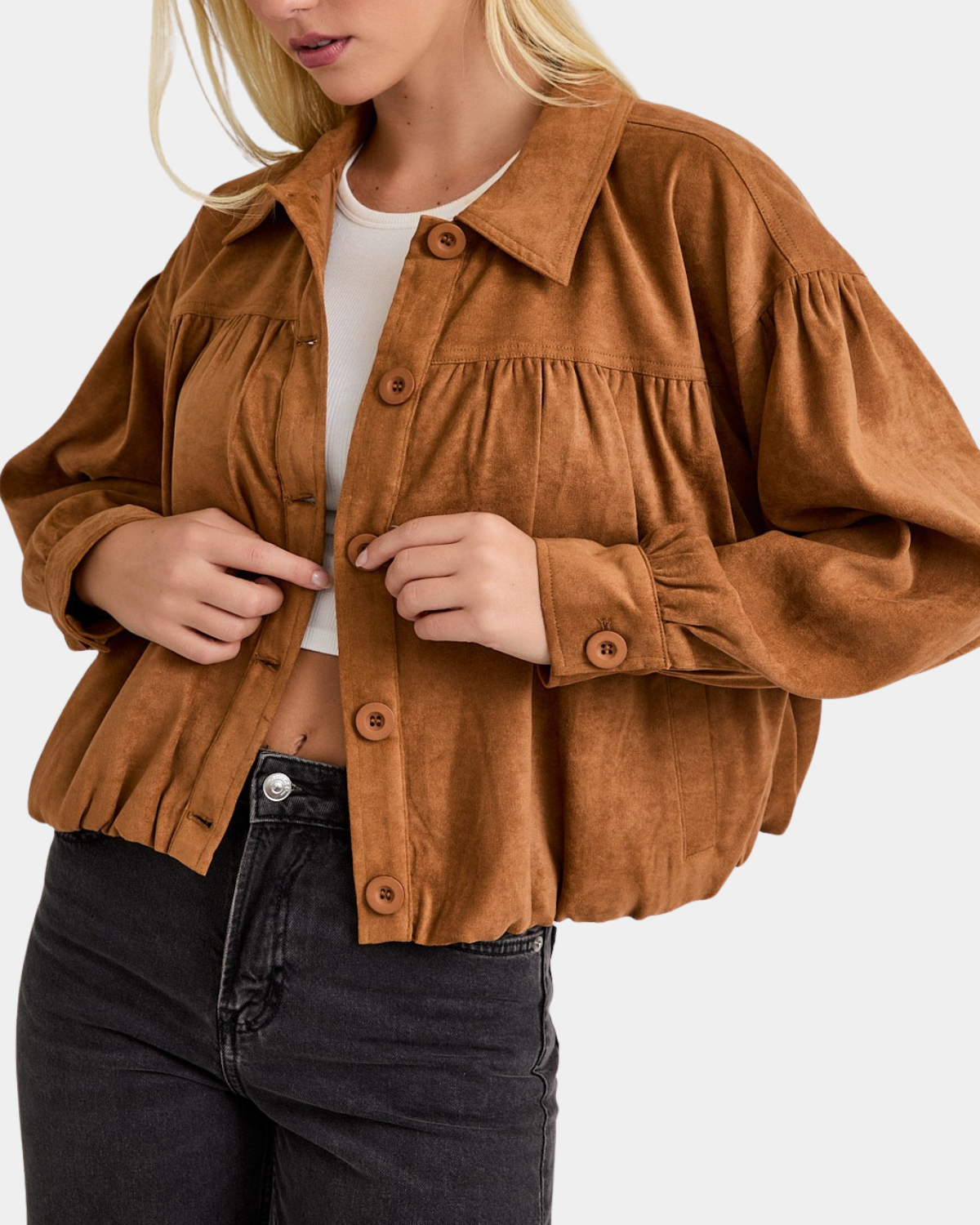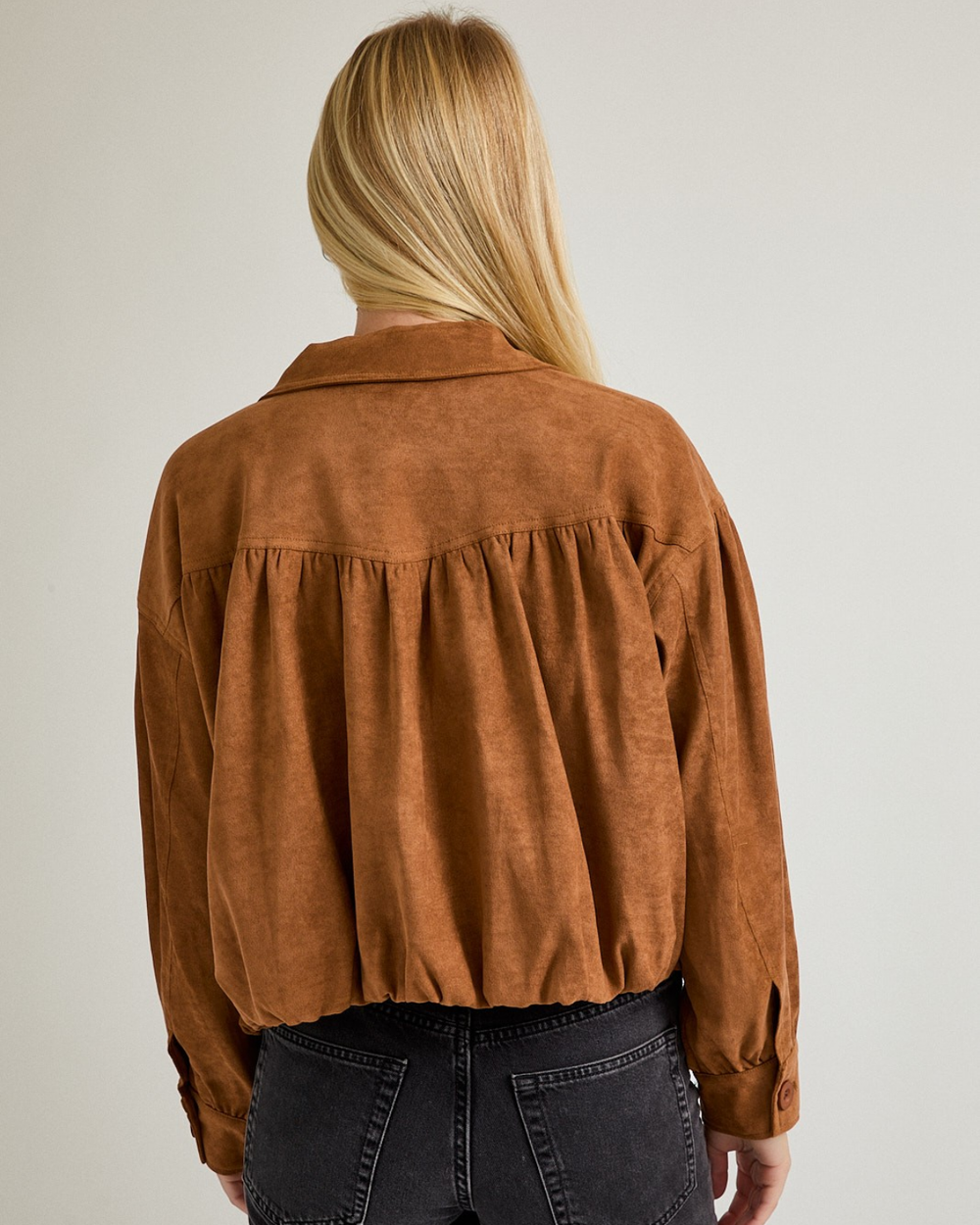 This camel suede jacket is your new go-to layer! Featuring charming shirring details that catch the light just right, it's soft, stylish, and ready to become your favorite piece.